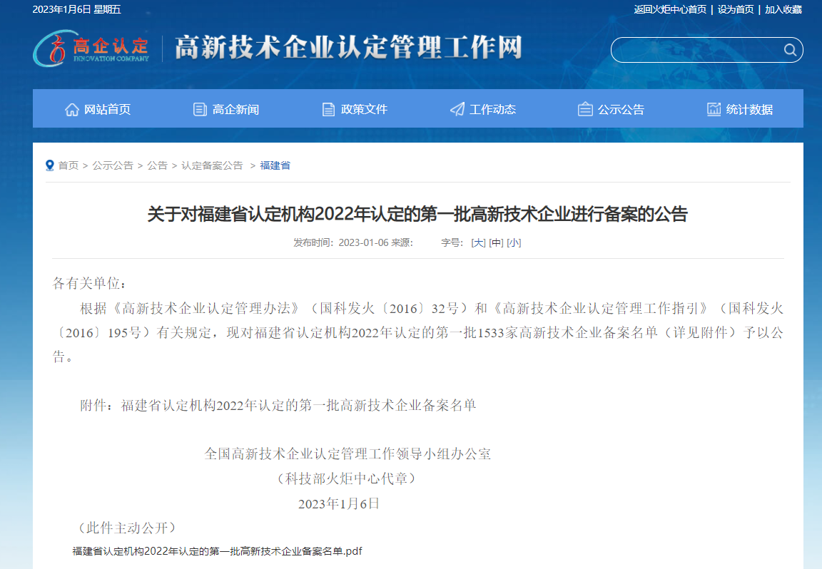 2023年1月6日,国家科学技术部火炬高技术产业开发中心(全国高新技术企业认定管理工作领导小组办公室)发布了《关于对福建省认定机构2022年认定的第一批高新技术企业进行备案的公告》,金年会中国jinnian成功通过国家高新技术企业认定。
