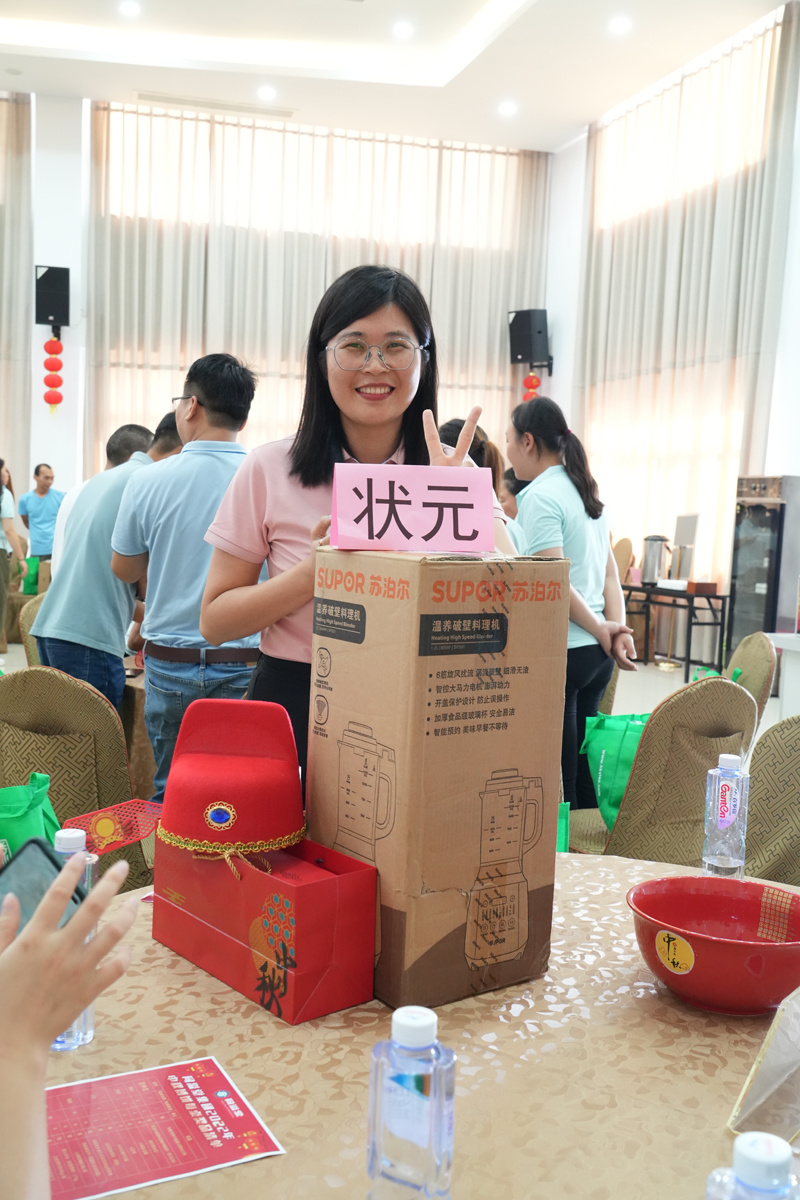 月圆中秋,共博头彩,博状元,是中秋博饼活动中最大的彩头,活动现场,大家围聚在状元碗前,骰子撞击碗边的声音、大家兴奋的喊声、每个人脸上洋溢的笑容,烘托出强烈的节日气氛。经过一番激烈的比拼,大家都收获了不少的战利品。